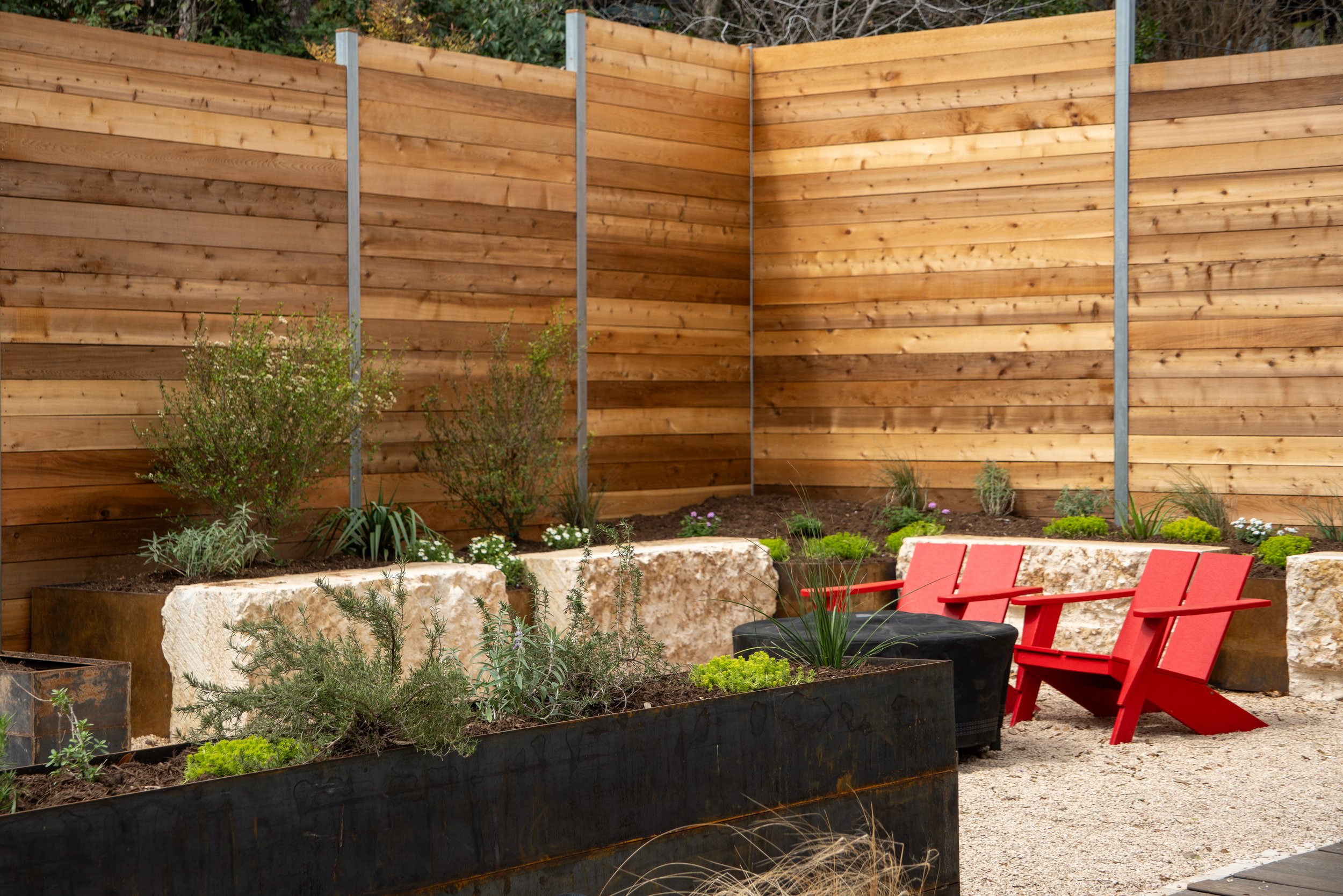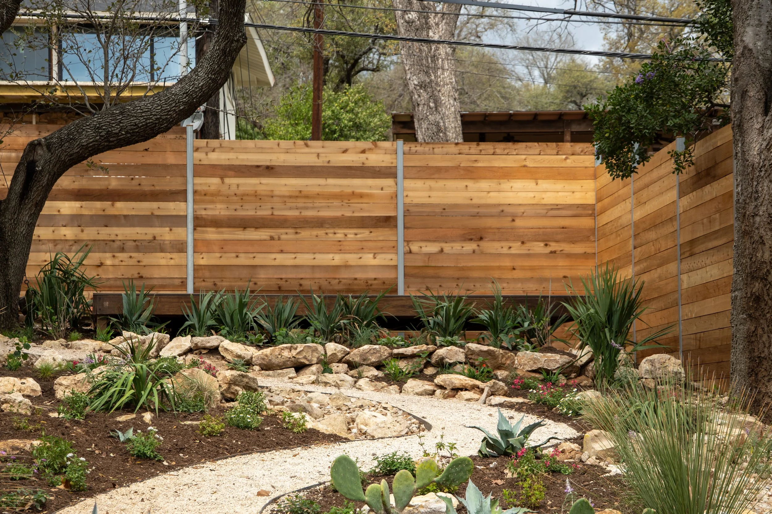 A horizontal semi-privacy fence defines the yard without shutting it in, letting more light through while keeping that sleek, linear look.