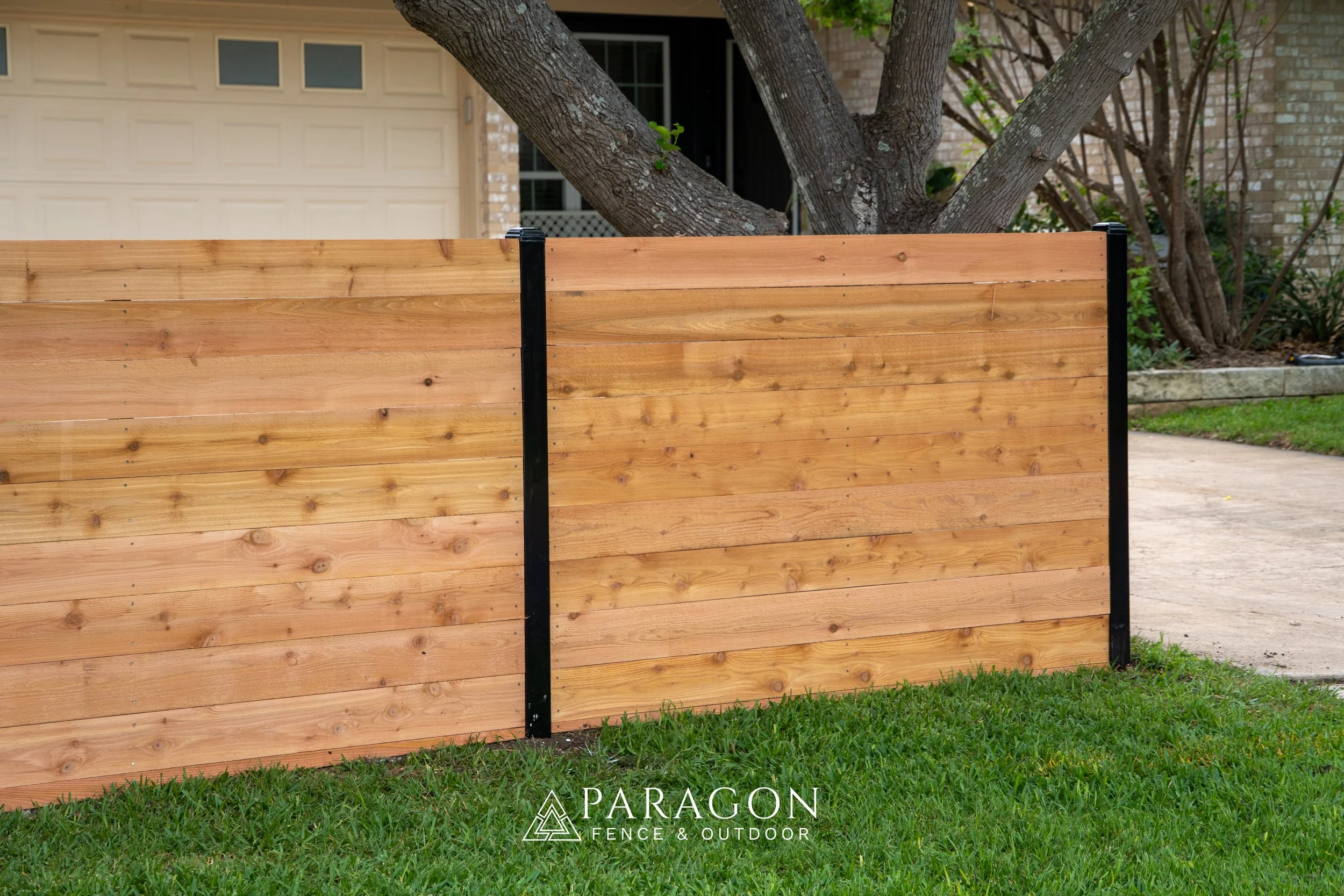 A horizontal fence with a semi-privacy top blends solid privacy on the lower half with a lighter, semi-open top section for a modern look that isn’t too heavy.